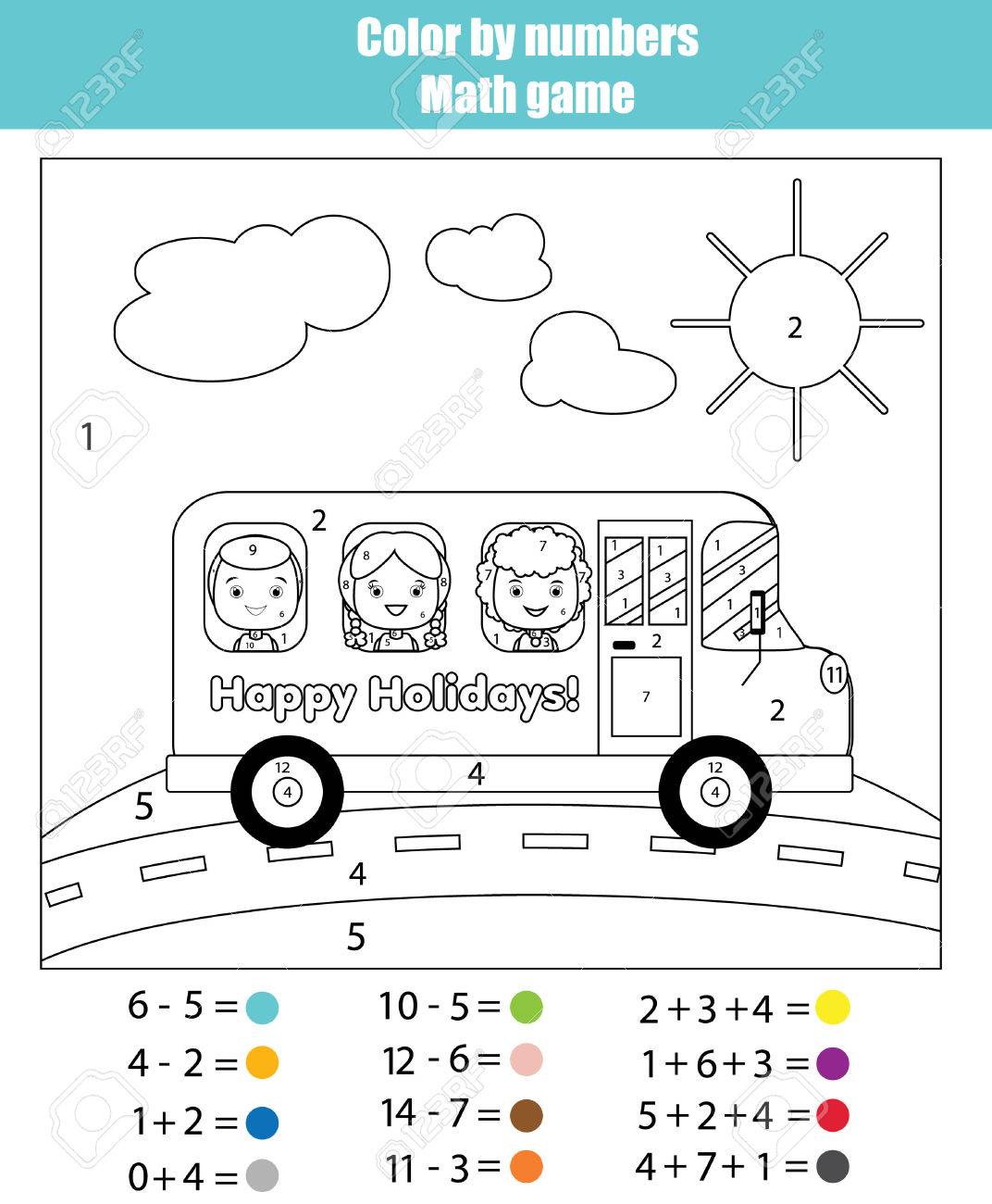 Coloring Page With Kids Traveling In School Bus Color By Numbers
